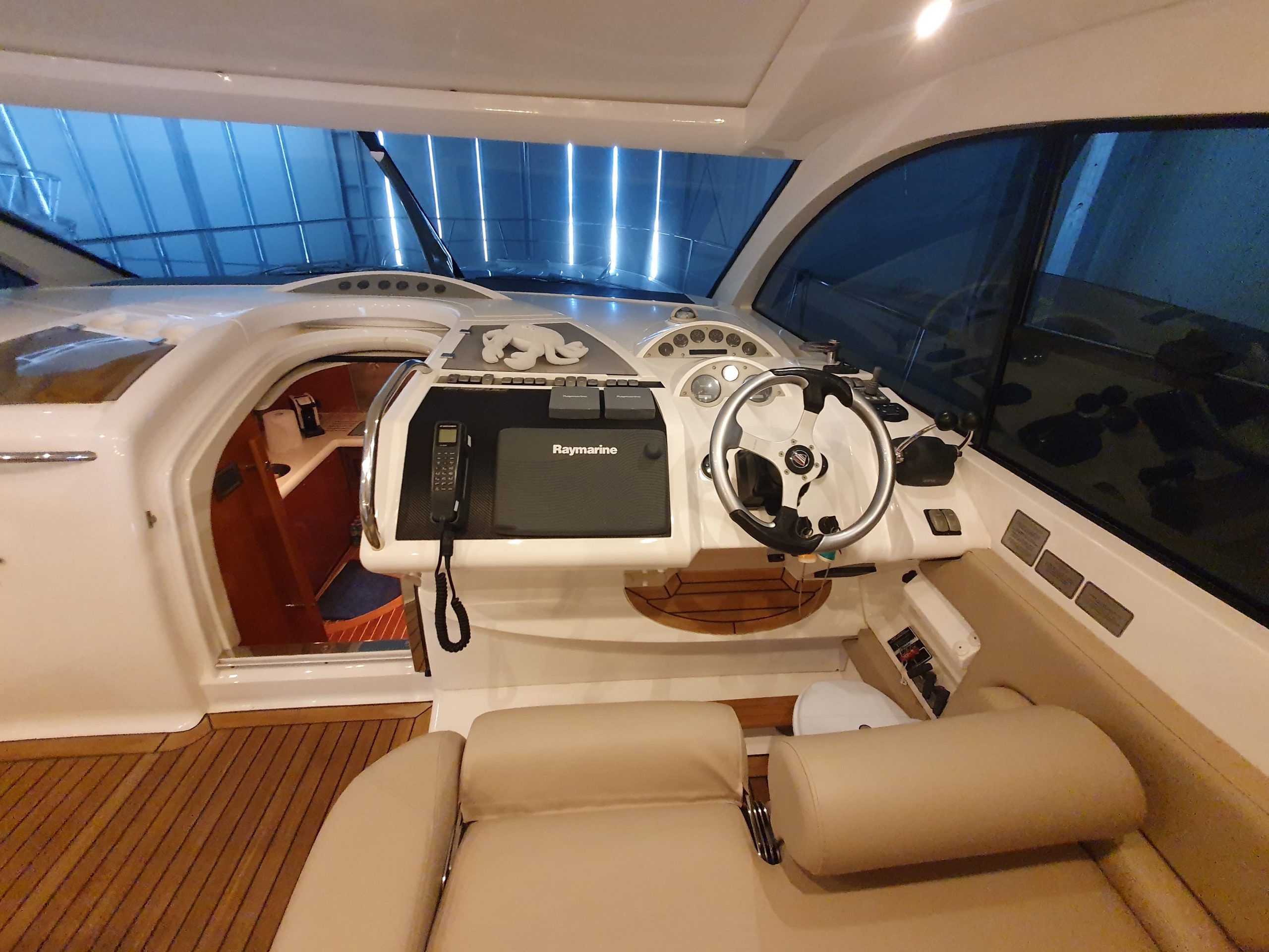 Strumentazione : Manette elettroniche, Gps Raymarine 12″, tv salone, interfaccia pilota/gps, verricelli da tonneggio, salpancora elettrico, impianto stereo, decoder antenna satellitare, raddrizzatore di corrente, antenna satellitare, pilota automatico, decoder per antenna satellitare, vhf, ecoscandaglio.