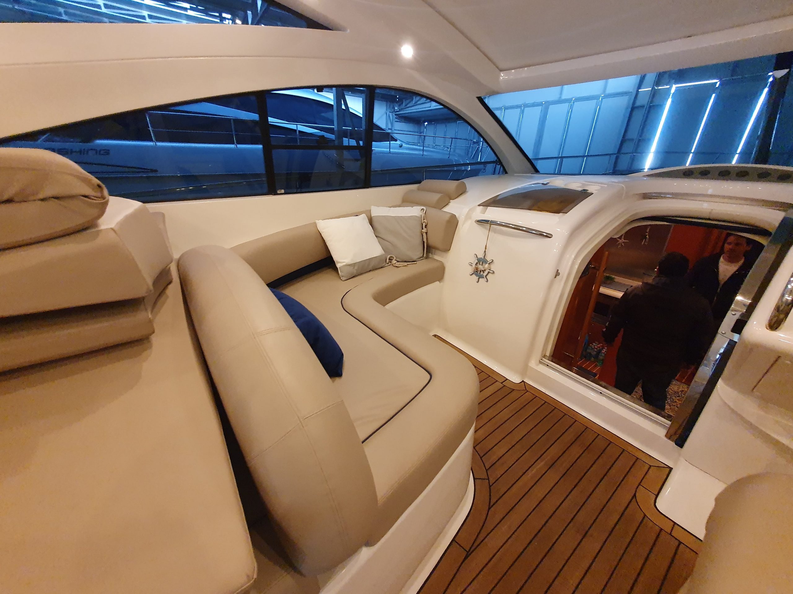 Armamenti : Teak in pozzetto 8mm, teak pedana di poppa, antincendio automatico, passerella idraulica, flaps idraulici, catena zincata, faro orientabile, telo copricuscineria, zattera, dotazioni di sicurezza, ancora in acciaio, hard top elettrico, telo copripozzetto (lungo), luci sotto plancetta con fibre ottiche, frigorifero cucina, frigo pozzetto esterno, barbecue in pozzetto, piastra in pozzetto con 2 fuochi, zanzariere oblò, aria condizionata in tutte le cabine, teli copri cuscineria.