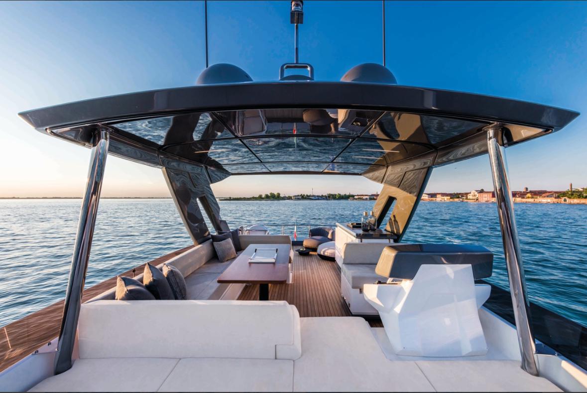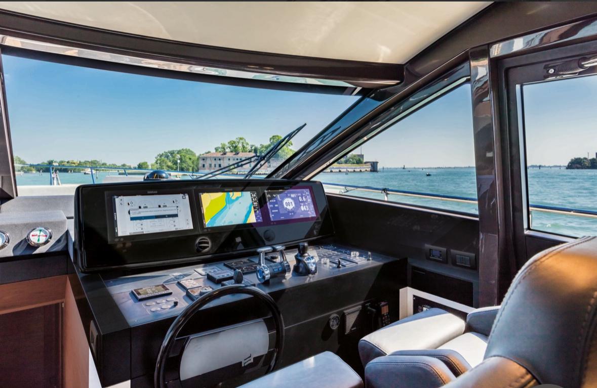 Sul fly incece troviamo Tavolo in teak abbattibile, Frigo 50 lt e grill Gaggenau. Oltre alla verniciatura antenna TV – VHF – Radar e Tromba, Contacatena digitale. Fabbricatore di ghiaccio con serbatoio indipendente, Verricello da tonneggio x2, Stazione di comando in pozzetto fissa con copertura.