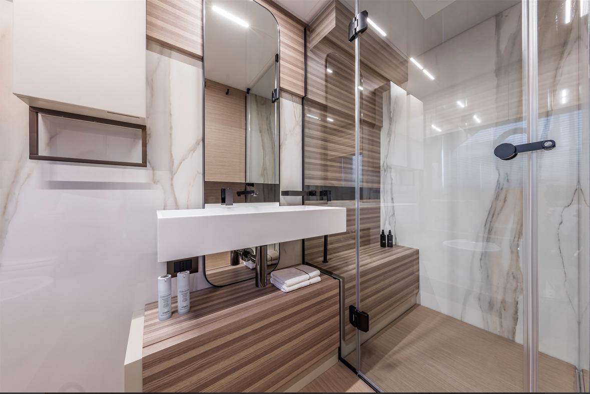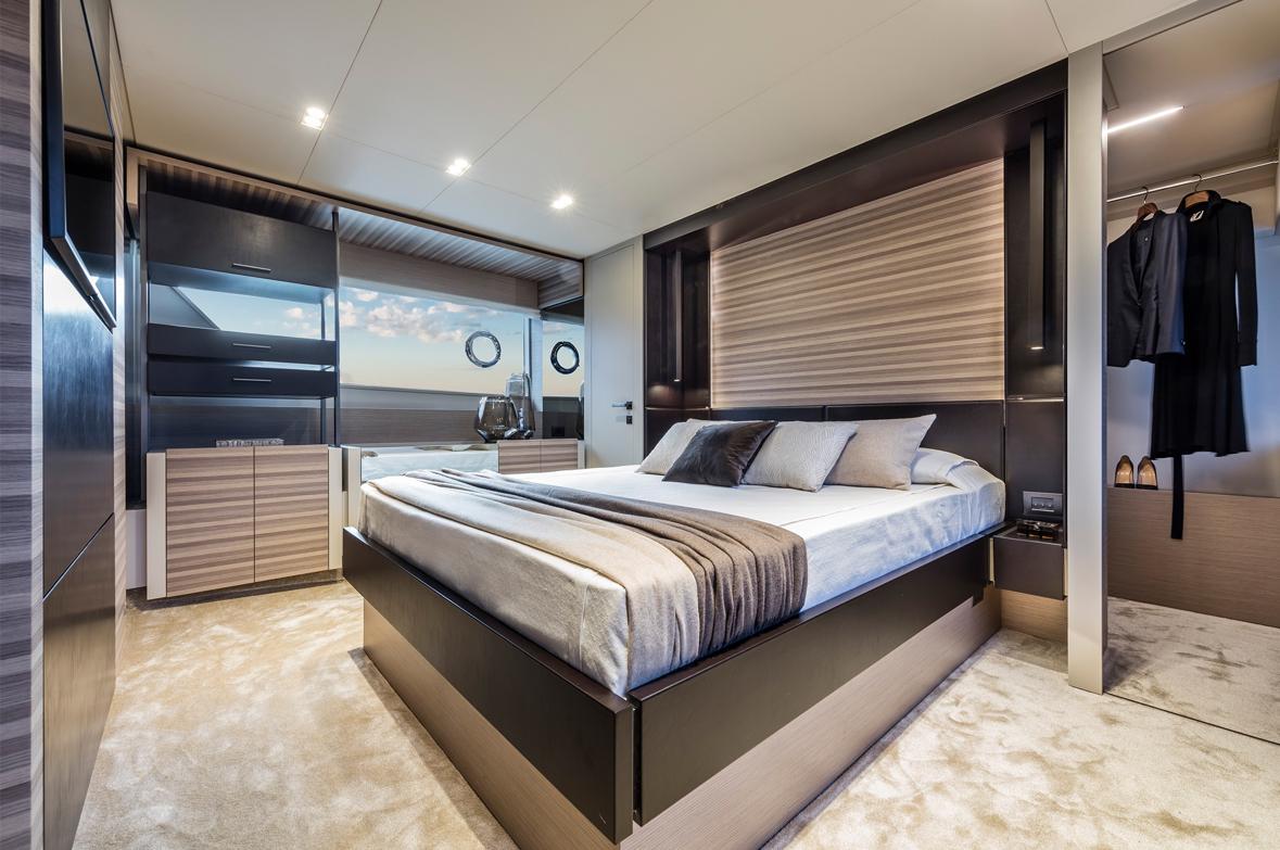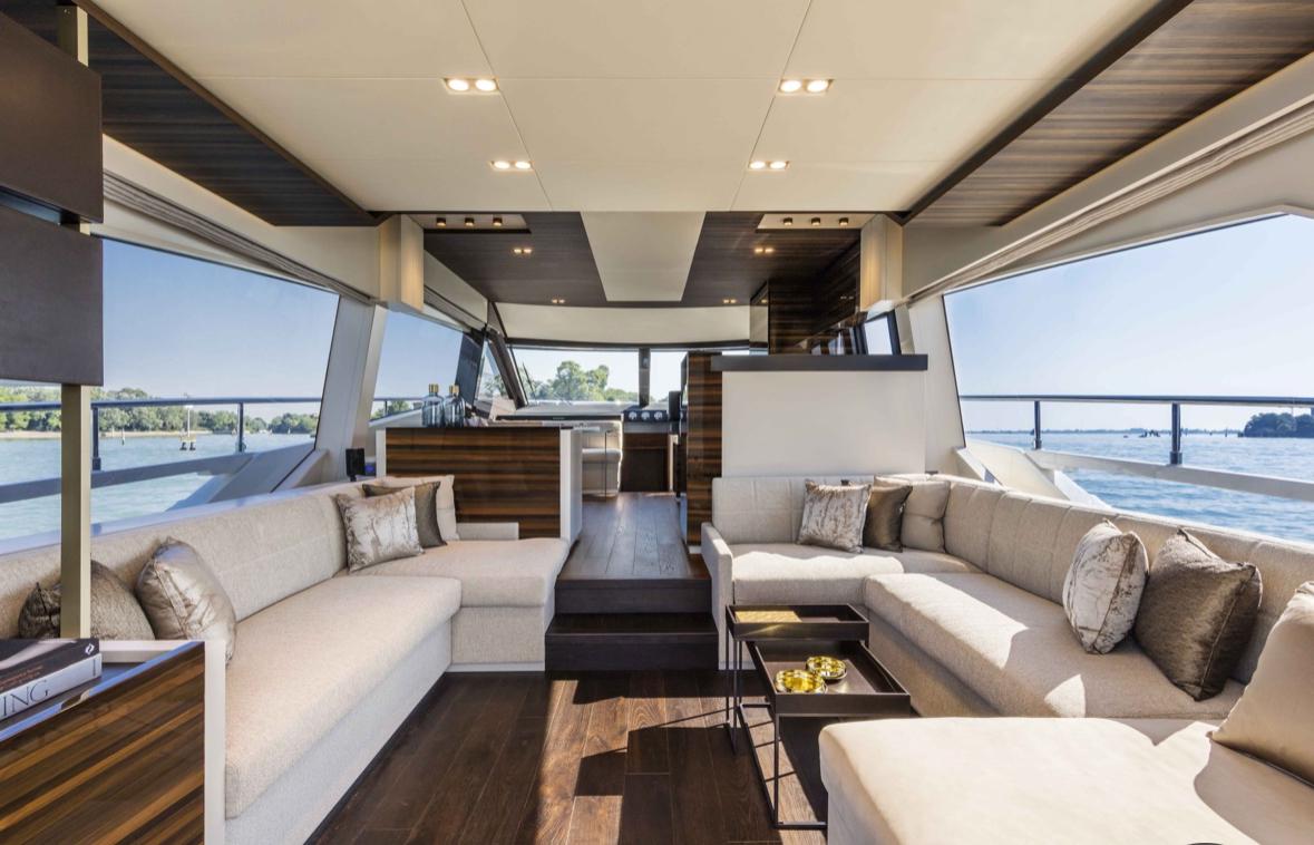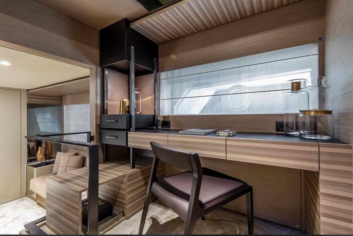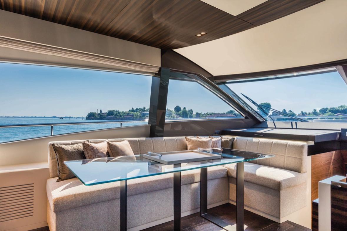 Gli interni sodo dotati di particolare di pregio come parete doccia armatore in Florim Calacatta Oro e rivestimenti salone e cabine. Coperture per esterni, Pavimento Main Deck in parquet, Divano dinette, Divani salone, Divano armatore, Cuscineria esterna, Sedili pilota in similpelle, Set letto G&M Floris, Teak massello 10mm sul fly, Tavolo in teak, Sistema idraulico Besenzoni per sali/scendi tavolo fly, Cuscino per tavolo fly, Puff fly “Talenti”, Tende ombreggianti fly, Doccetta fly, Attacco pompa lavaggio barca sotto mobile bar del fly e sotto il gavone di poppa.